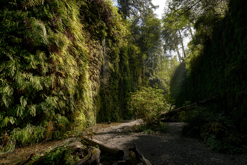 A small waterfall drips down the wall into Fern Canyon. Located in Norther California's Prairie Creek Redwoods State Park, Fern Canyon is situated along the coast and is a 1 mile long canyon with walls thickly covered in ferns. The ambiance and natural beauty of Fern Canyon led to it being used as a filming location for Jurassic Park: The Lost World.