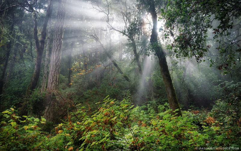 A light fog creating sun rays after the first rain of fall. Taken in Sam McDonald County Park near La Honda, CA.