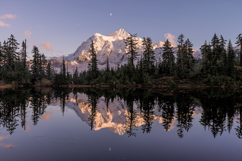 The last rays of sunset illuminating the peak of Mt. Shuksan in the North Cascades. Mt. Shuksan rises to 9,131 ft with a prominence of 4,411 ft. It's English name is derived from it's name in the Nooksack language, Shéqsan, meaning 'high foot', or Ch’ésqen meaning 'golden eagle.'