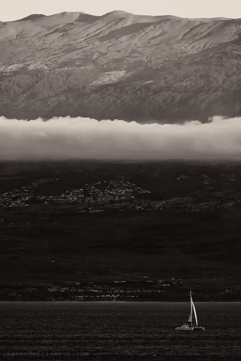 Looking across Maalaea Bay to the coastal town of Kihei, the upcountry town of Kula, and the summit of Haleakala as the last bit of light hits the peak.