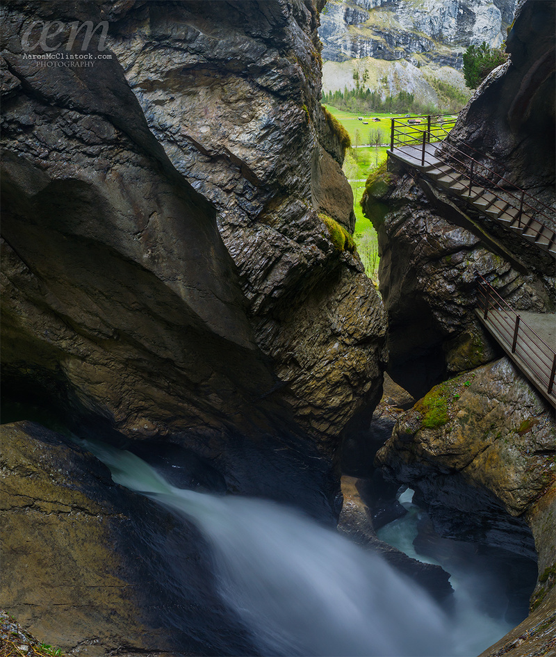 The cavernous Trummelback Falls carves it's way through the rock walls of Lauterbrunnen Valley.