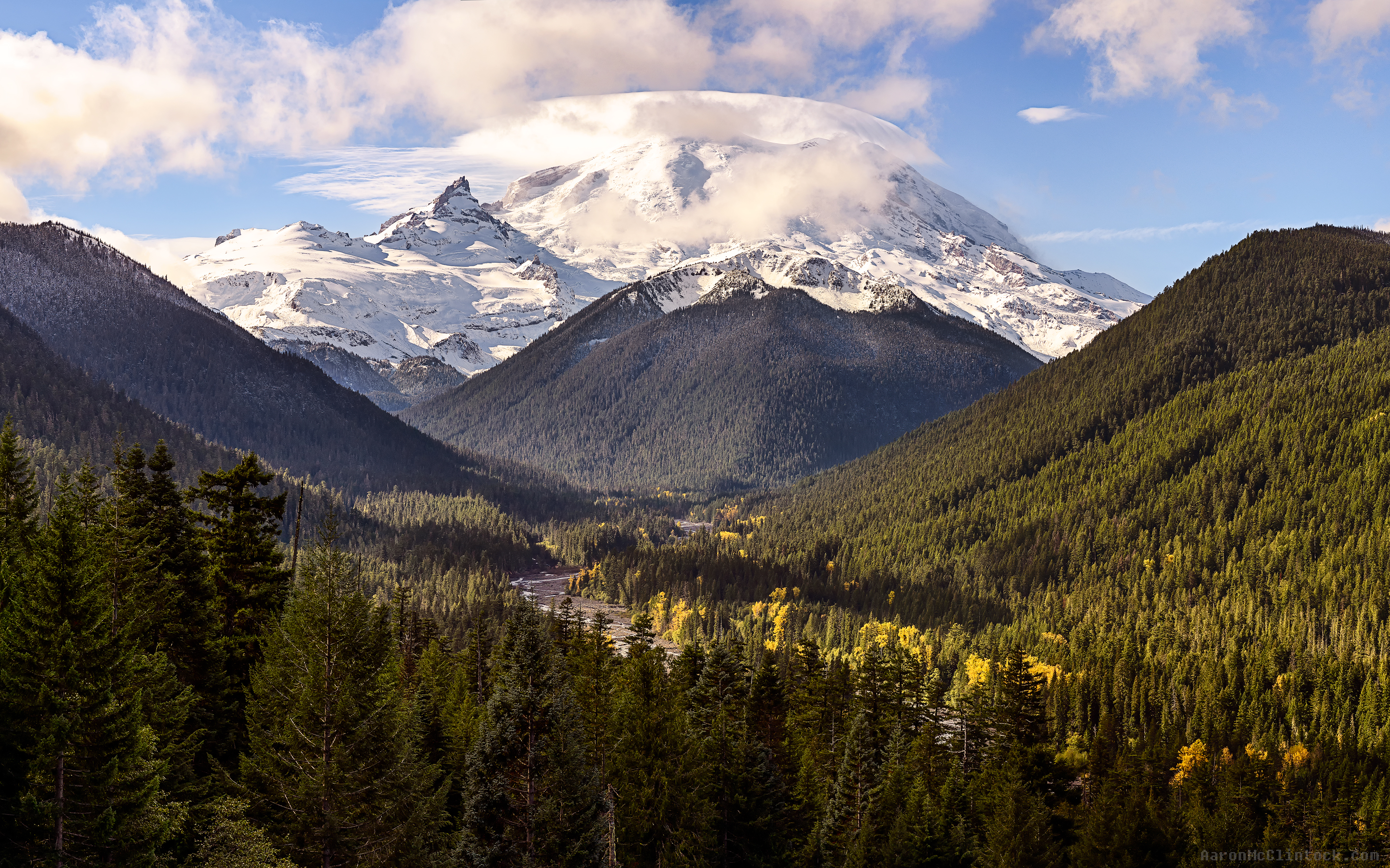 The White River winding away from Mount Rainier. The source of the White River is Mount Rainier's Emmons Glacier visible on the left of the mountain.